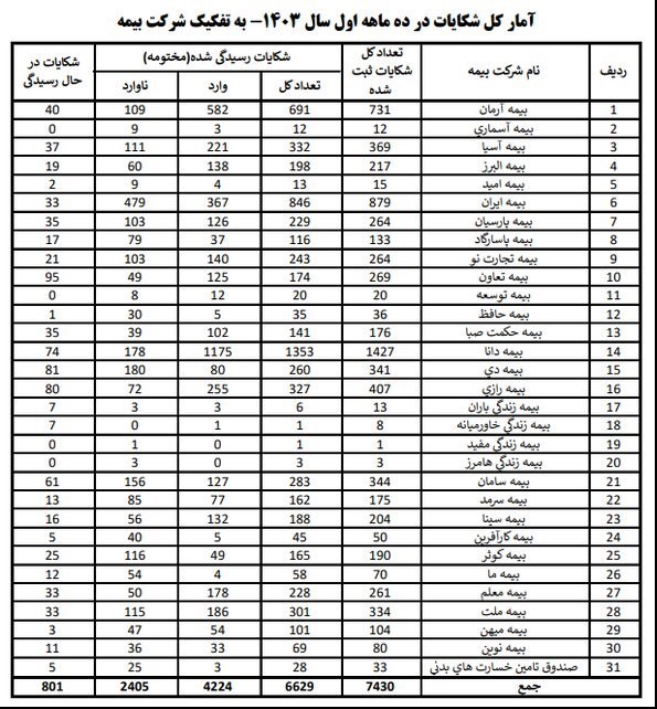 بر اساس آمار کل شکایات به شرکتهای بیمهای در 10 ماهه سال جاری در مجموع تعداد کل شکایات ثبت شده به 7430 فقره میرسد که از این میان به 6629 فقره رسیدگی شده و 801 فقره در حال رسیدگی است. از میان شکایات رسیدگی شده 4224 فقره شکایت به شرکتهای بیمهای وارد بود و تعداد 2405 فقره شکایت وارد نبوده است که نشان دهنده سهم 56.8 درصدی شکایات وارده به شرکتها از میزان کل شکایات ثبت شده است.