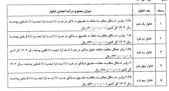 خانوارهای واقع در دهک های هشتم، نهم و دهم که بر اساس داده های پایگاه میانگین مجموع درآمد ماهانه اعضای آنها در فاصله زمانی شش ماهه به روزرسانی اطلاعات توسط وزارت تعاون به میزان مندرج در جدول زیر یا بیشتر باشد غیر مشمول حمایت دولت موضوع این آیین نامه تلقی می شوند.