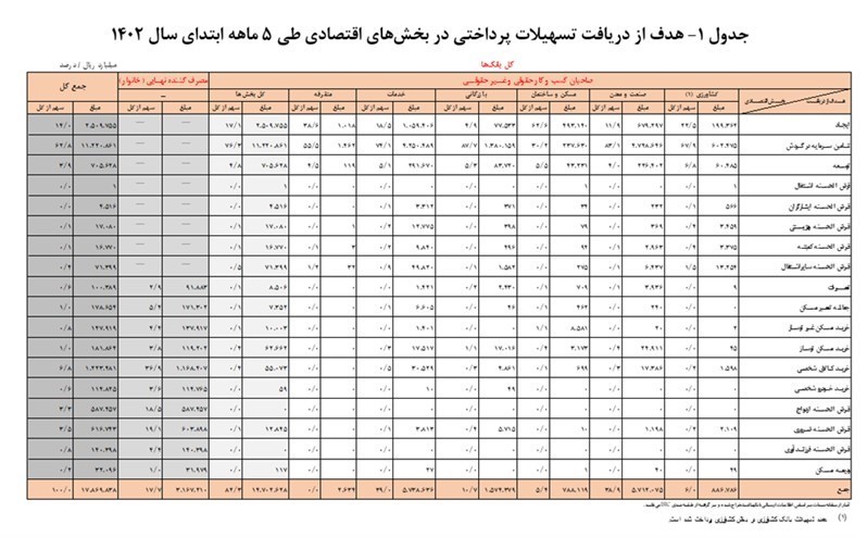 جدول 1 بیانگر هدف از دریافت تسهیلات پرداختی در بخشهای اقتصادی طی 5 ماهه ابتدای سال 1402 میباشد. سهم تسهیلات پرداختی در قالب سرمایه در گردش در کلیه بخشهای اقتصادی طی 5 ماهه سال 1402 مبلغ 11220.9 هزار میلیارد ریال معادل 76.3 درصد کل تسهیلات پرداختی به صاحبان کسب و کار است. همچنین سهم تسهیلات پرداختی در قالب خرید کالای شخصی توسط مصرف کننده نهایی (خانوار) مبلغ 1168.4 هزار میلیارد ریال معادل 36.9 درصد از کل تسهیلات پرداختی به مصرف کنندگان نهایی (خانوار) میباشد.