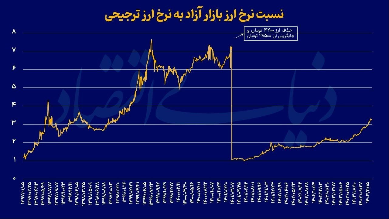آمارها حاکی از آن است که در زمان آغاز اعطای ارز 4200تومانی، یعنی سال 1397، نسبت نرخ ارز آزاد به ارز ترجیحی حدود 1.2واحد بود، اما این نسبت در اواخر اردیبهشت‌ماه 1401 به 7.2واحد رسید. این موضوع باعث شد تا نرخ ارز ترجیحی با یک جهش شدید از 4200تومان به 28هزار و 500تومان افزایش یابد. افزایش نسبت ارز آزاد به ارز ترجیحی نشان از افزایش شکاف بین این دو با افزایش نرخ ارز ترجیحی  دارد و بار دیگر نسبت نرخ ارز آزاد به ارز ترجیحی به سطح 1.2واحد بازگشت. با این حال، این نسبت از اردیبهشت‌ماه 1401 تا اسفندماه 1403 به حدود 3.3واحد افزایش یافته است. در صورت تداوم این شرایط و بدون تعدیل نرخ ارز ترجیحی، می‌‌‌توان احتمال داد که نسبت نرخ ارز آزاد به ارز ترجیحی همچنان افزایش یابد و دولت بار دیگر مجبور به تغییر نرخ ارز ترجیحی شود. به گفته کارشناسان، تا زمانی که نرخ ارز تک‌‌‌نرخی نشود و ریسک‌‌‌های سیاست خارجی رفع نشود، نوسانات نرخ ارز و رانت ارزی همچنان ادامه‌‌‌دار خواهد بود.