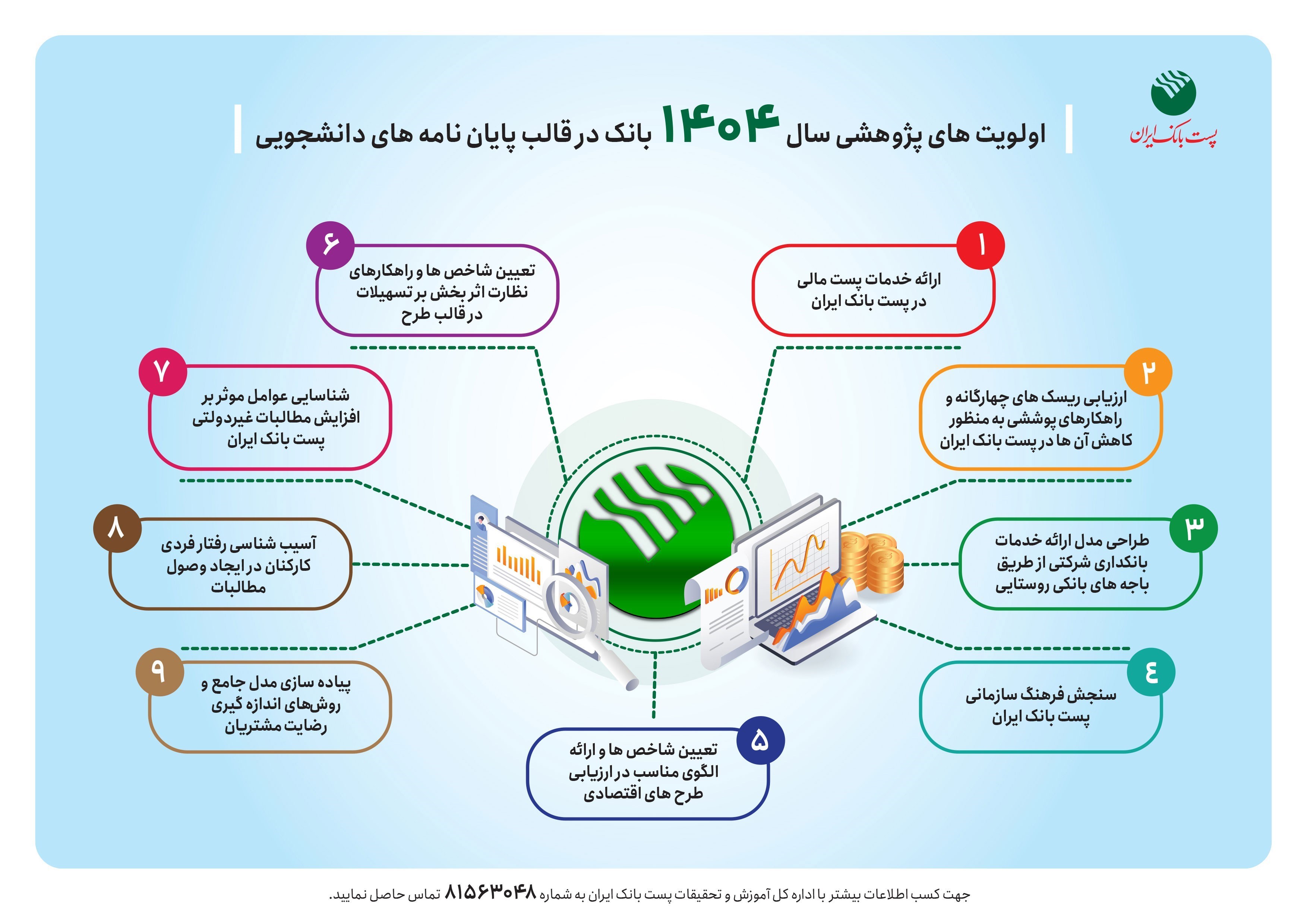 همچنین 9 اولویت پژوهشی، ارائه خدمات پست مالی در پست بانک ایران، ارزیابی ریسک های چهارگانه و راهکارهای پوششی به منظور کاهش آن ها در پست بانک ایران، طراحی مدل ارائه خدمات بانکداری شرکتی از طریق باجه های بانکی روستایی، سنجش فرهنگ سازمانی پست بانک ایران، تعیین شاخص ها و ارائه الگوی مناسب در ارزیابی طرح های اقتصادی، تعیین شاخص ها و راهکارهای نظارت اثر بخش بر تسهیلات در قالب طرح، شناسایی عوامل موثر بر افزایش مطالبات غیردولتی پست بانک ایران، آسیب شناسی رفتار فردی کارکنان در ایجاد وصول مطالبات و پیاده سازی مدل جامع و روش های اندازه گیری رضایت مشتریان در قالب پایان‌نامه دانشجویی مورد تصویب قرار گرفته است.