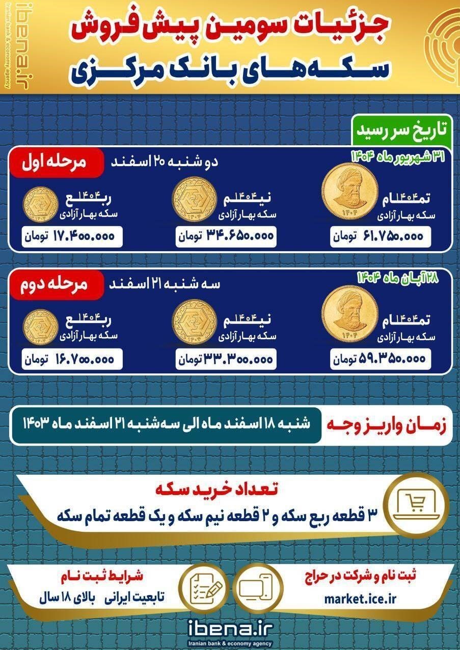 بر این اساس کسانی که قصد خرید سکه با سررسید 31 شهریور 1404 را دارند، میتوانند از امروز 20 اسفندماه اقدام کنند. همچنین، ثبتنام برای پیشخرید سکههایی با سررسید 28 آبان 1404 نیز در روز 21 اسفندماه انجام خواهد شد.