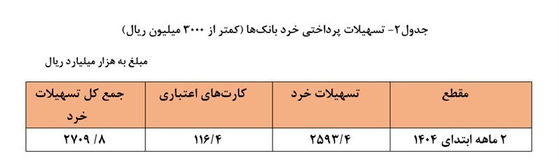 از کل تسهیلات پرداختی در دوره یاد شده، مبلغ 2593.4 هزار میلیارد ریال معادل 23.0 درصد به صورت تسهیلات خرد اعطا شده است. همچنین مبلغ 116.4 هزار میلیارد ریال نیز در قالب کارتهای اعتباری انجام پذیرفته است، که با احتساب این مبلغ، کل تسهیلات پرداختی خرد (کمتر از سه میلیارد ریال) به مبلغ 2709.8 هزار میلیارد ریال معادل 23.8 درصد کل تسهیلات پرداختی را شامل میشود. شایان ذکر است با توجه به اینکه تسهیلات پرداختی در قالب کارتهای اعتباری نیز در بخش خانوار پرداخت شده است، با این اوصاف سهم بخش خانوار از 24.9 درصد در جدول-1، به 25.7 درصد کل تسهیلات پرداختی افزایش پیدا میکند.