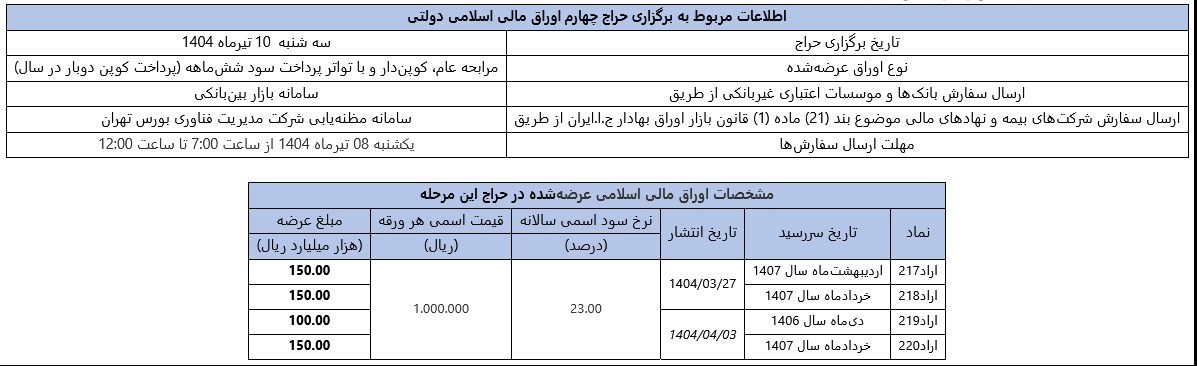 عصر اعتبار- حراج چهار اوراق مالی اسلامی دولتی روز سه شنبه، دهم تیرماه سال جاری برگزار می شود.