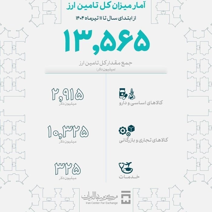 همچنین براساس اعلام مرکز مبادله ایران، از ابتدای سال 1404 تا 11 تیرماه، 13 میلیارد و 565 میلیون دلار از سوی بانک مرکزی برای واردات کالای اساسی و دارو، صنایع و نیازهای خدماتی تامین ارز شده است.