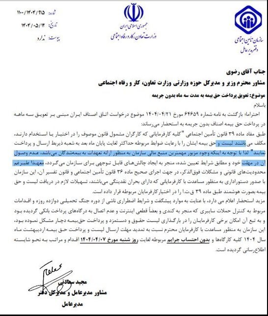 در ادامه نیز آمده است: «مزید استحضار اعلام می‌دارد، با عنایت به موارد پیشگفت و شرایط اضطراری ناشی از دوره جنگ تحمیلی 12 روزه و اقدامات مربوط به کنترل حملات سایبری که منجر به کندی و بعضاً قطعی اینترنت و عدم اتصال به درگاه‌های پرداخت بانکی شده بود و به تبع آن امکان برخی کارفرمایان را در بارگذاری لیست حقوق و دستمزد و پرداخت حق‌بیمه دچار مشکل کرده بود، این سازمان به منظور مساعدت با کارفرمایان نسبت به تمدید مهلت ارسال لیست و پرداخت حق بیمه اردیبهشت‌ماه سال 1404 کلیه کارگاه‌ها و بدون احتساب جرایم مربوطه لغایت روز شنبه مورخ 1404/04/07 اقدام و مراتب به نحو شایسته اطلاع رسانی شده است.»