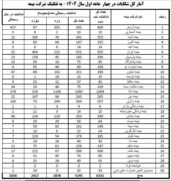 این آمار نشاندهنده عملکرد رسیدگی به شکایات بیمهای در چهار ماهه اول سال جاری است که در برخی رشتهها، شکایات بیشتری ثبت شده و در پارهای موارد وضعیت رسیدگی به شکایات بهطور نسبی بهتر بوده است. به طور کلی این شکایات، توسط بیمهگذاران و ذی نفعان بیمهنامه در سامانه رسیدگی و پاسخگویی به شکایات ثبت شده به صورت جداول آماری و به تفکیک همه رشتهها و با هدف شفافیت عملکردی، تسهیل در ثبت، بهبود فرایند رسیدگی اعلام شکایت بیمهگذاران از شرکتهای بیمه، منتشر میشود که بر اساس آن، میزان شکایات صورت گرفته به شرکتهای بیمهای مشخص شده است