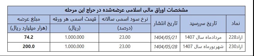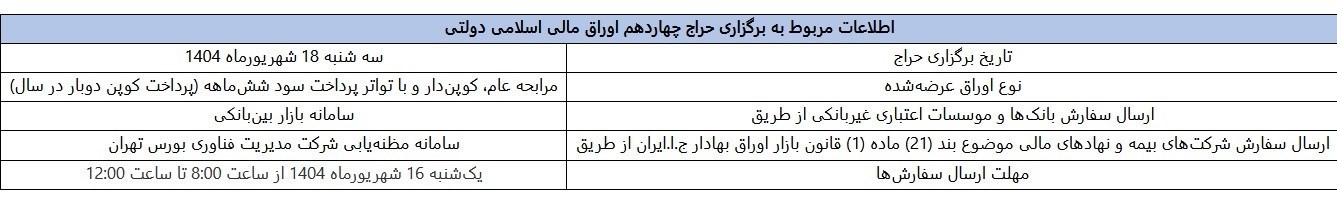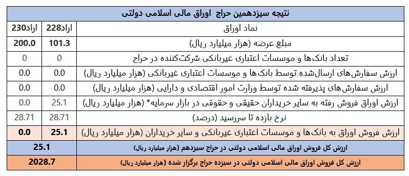 عصر اعتبار- نتیجه سیزدهمین مرحله از حراج اوراق مالی اسلامی دولتی در سال ۱۴۰۴ (در تاریخ ۱۲ شهریورماه ۱۴۰۴) اعلام شد. همچنین تاریخ برگزاری حراج جدید اوراق یاد شده در تاریخ ۱۸ شهریور ماه سال جاری خواهد بود.