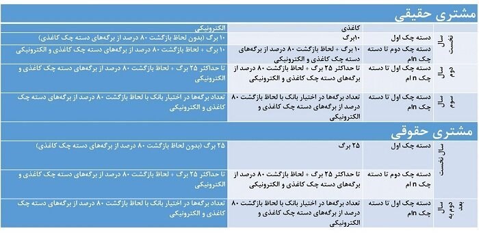 همچنین مشتریان حقوقی نخستین بار در سال اول، مجاز به دریافت دسته چک حداکثر 25 برگی کاغذی و به صورت همزمان بدون لحاظ بازگشت 80 درصد از برگههای دسته چک کاغذی، مجاز به دریافت 25 برگ دسته چک الکترونیکی هستند.