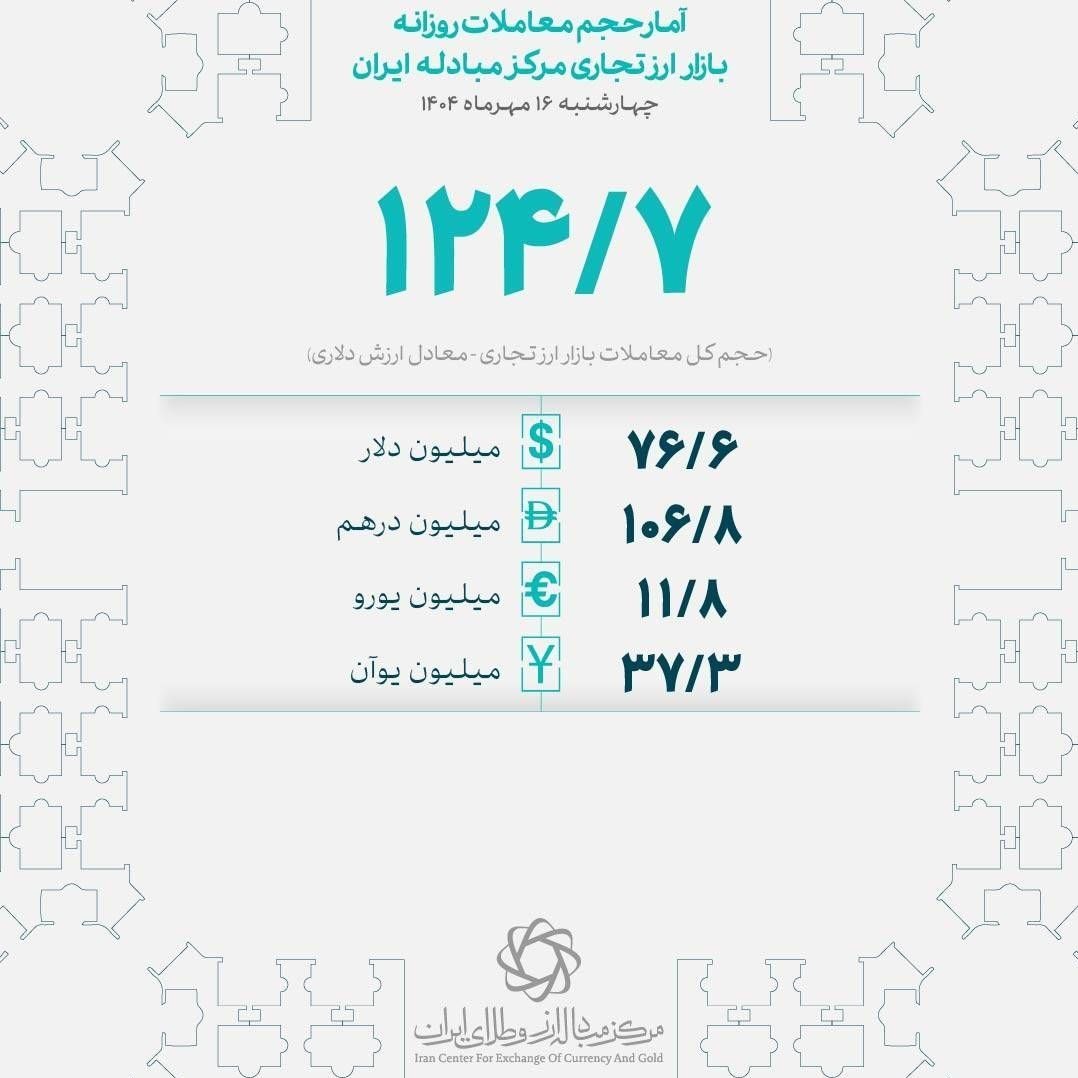 بر اساس گزارش مرکز مبادله طلا و ارز، روز چهارشنبه 16 مهر، حجم کل معاملات بازار ارز تجاری مرکز مبادله ایران به تفکیک نوع ارز، 76.6 میلیون دلار، 106.8 میلیون درهم، 11.8 میلیون یورو و 37.3 میلیون یوآن مورد دادوستد قرار گرفت؛ معادل ارزش دلاری این حجم معاملات 124.7 میلیون دلار است.