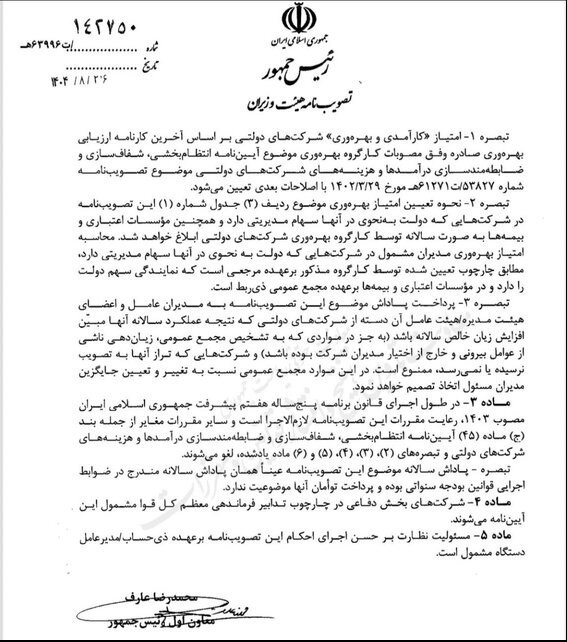 «همیشه مردم معترض بودن چرا شرکت زیانده است اما مدیران پاداش میگیرند! حالا اگر شرکتی که دولت به نحوی در آنها سهم مدیریتی یا کنترلی دارد با عملکرد مدیرانش به زیان شرکت اضافه شود ضمن ممنوعیت پاداش! مجمع عمومی برگزار میشود و مدیران تغییر خواهند کرد.»