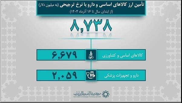به گزارش پایگاه خبری «عصر اعتبار» به نقل از روابط عمومی بانک مرکزی از این میزان، 8 میلیارد و 738 میلیون دلار به واردات کالاهای اساسی و دارو شامل 6 میلیارد و 679 میلیون دلار برای نهادهها و بخش کشاورزی و 2 میلیارد و 59 میلیون دلار برای واردات دارو و تجهیزات پزشکی تخصیص یافته است.