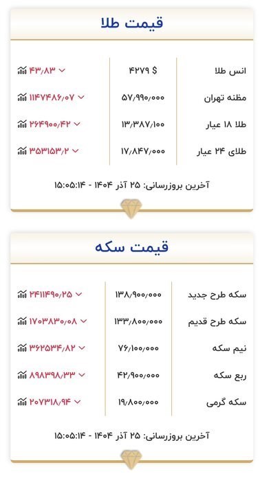 به گزارش پایگاه خبری «عصراعتبار» به نقل از ایرنا، اتحادیه طلا و جواهر تهران بهای هر اونس طلا را برای معاملات روز سه شنبه (25 آذرماه) چهار هزار و 279 دلار اعلام کرد که نسبت به دوشنبه بیش از 43 دلار کاهش یافت. اما به دلیل کاهش قیمت دلار در بازار غیررسمی، بهای انواع مسکوکات و مصنوعات طلا همچنان به روند صعودی خود پایان داد.