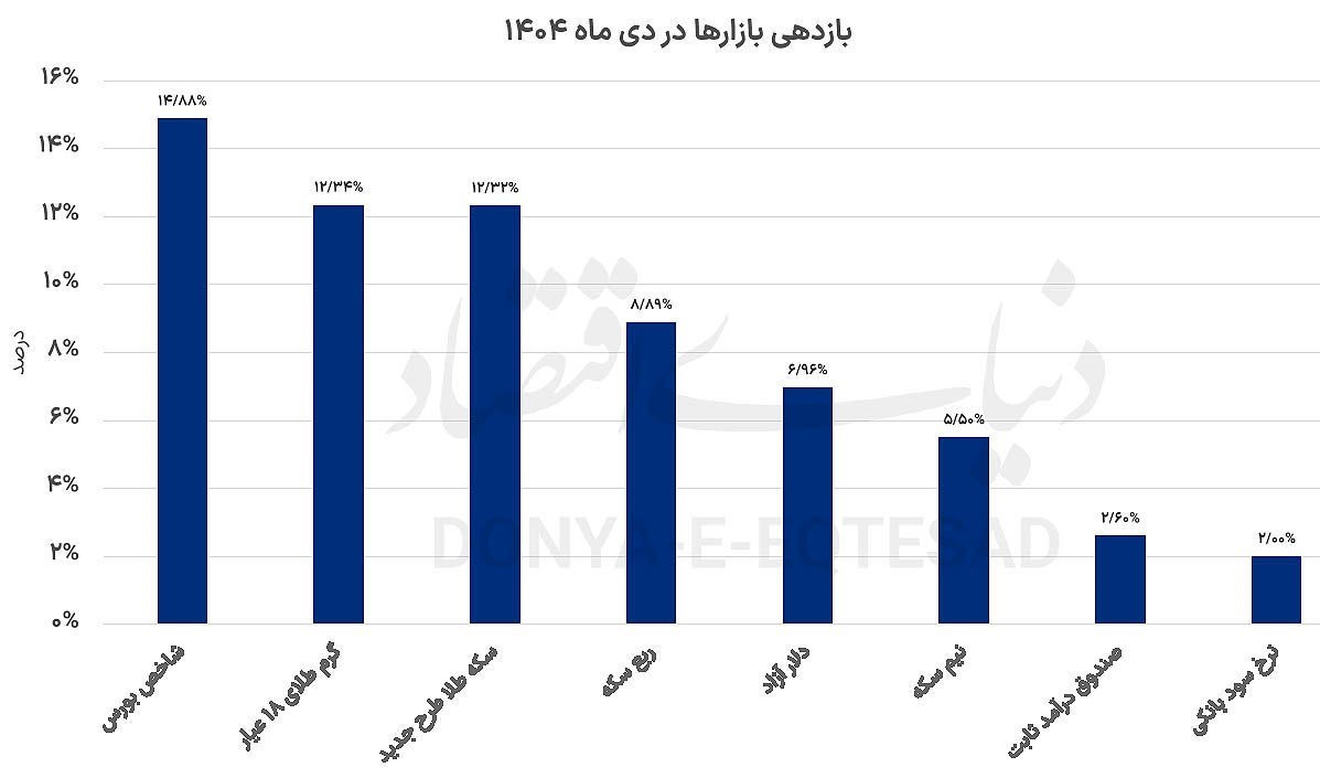 عصر اعتبار- بررسیها نشان میدهد که در ۱۰ماه نخست سال جاری طلای ۱۸عیار با ثبت بازدهی ۸۸درصدی بیشترین رشد قیمتی را ثبت کرد. بورس تهران نیز با ثبت بازدهی ۶۵ درصد در جایگاه دوم قرار گرفت. نکته قابل توجه اینکه در دی ماه امسال، بورس تهران با ثبت رقم ۱۵درصدی در جایگاه نخست بازدهی قرار دارد و طلا با بازدهی ۱۲درصدی در جایگاه دوم قرار گرفت.