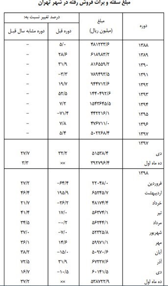 عدد شاخص مذکور در دی ماه 97 معادل 171.4 بوده است. در 10 ماه اول سال 98 معادل 6400 برگ سفته و برات به مبلغی معادل 1352.4 میلیارد ریال در شهر تهران واخواست شد. در این دوره، متوسط شاخصهای تعداد و مبلغ سفته و برات واخواست شده به ترتیب به اعداد 80.3 و 73.3 رسید که نسبت به دوره مشابه سال قبل به ترتیب 6.6 درصد و 43.6 درصد کاهش نشان میدهد. شاخص متوسط مبلغ یک برگ سفته و برات واخواست شده در 10 ماه اول سال 1398 به عدد 94.5 رسید. عدد شاخص مذکور در 10 ماه اول سال 1397 معادل 143.4 بوده است.