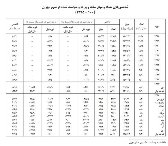 طبق آمار شعبه واخواست دادگستری استان تهران در دی ماه 98 معادل 800 برگ سفته و برات به مبلغی معادل 191.1 میلیارد ریال در شـهر تهران واخواسـت شد. در این ماه شاخصهای تعداد و مبلغ سفته و برات واخواست شـده بـه ترتیب به اعداد 103.9 و 103.6 رسید که در مقایسه با ماه قبل شاخص تعداد 5.3 درصد کاهش و شاخص مبلغ 39.2 درصد افزایش داشت و نسبت به ماه مشابه سال قبل از لحاظ تعداد 11.4 درصد افزایش و از لحاظ مبلـغ 35.3 درصد کاهش نشان میدهد. شاخص متوسـط مبلغ یک برگ سفته و برات واخواست شده در دی ماه 98 به عدد 99.7 رسید.