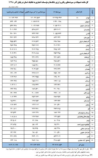 بانک مرکزی توضیح داده است که یکی از علل مهم بالا بودن رقم تسهیلات و سپردهها در استان تهران استقرار دفاتر مرکزی بسیاری از شرکتها و موسسههای تولیدی سایر استانها در استان تهران بوده و عمده فعالیتهای بانکی آنها توسط شعب بانکها و موسسههای اعتباری استان تهران انجام میشود.