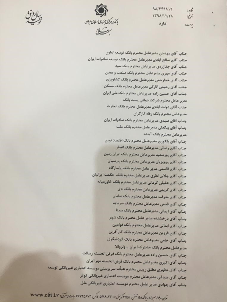 پیرو این نامه مدیریت کل مقررات، مجوزهای بانکی و مبارزه با پولشویی و اداره مطالعات و مقررات بانکی در نامه ای به مدیران عامل بانک ها و موسسات مالی این نامه را ابلاغ کردند.