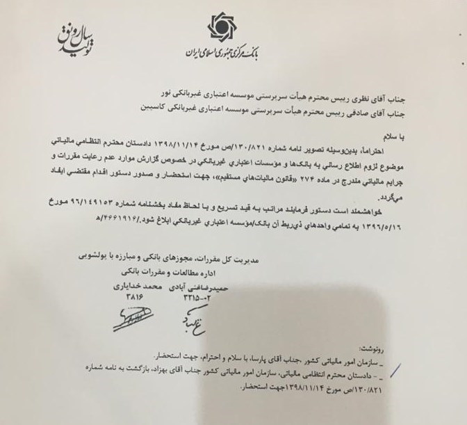 در نامه مورخ 28 بهمن 98 خطاب به تمام مدیران عامل بانکی آمده است: بدینوسیله تصویر نامه شماره 130/821/ص مورخ 1398/11/14 دادستان محترم انتظامی مالیاتی موضوع لزوم اطلاع رسانی به بانکها و مؤسسات اعتباری غیربانکی در خصوص گزارش موارد عدم رعایت مقررات و جرایم مالیات مندرج در ماده 274 قانون مالیاتهای مستقیم، جهت استحضار و صدور دستور اقدام مقتضی ایفاد می گردد. خواهشمند است دستور فرمایید مراتب به قید تسریع و با لحاظ مفاد بخشنامه شماره 99/199103 مورخ 1396/5/16 به تمامی واحدهای ذیربط آن بانک مؤسسه اعتباری غیربانکی ابلاغ شود.