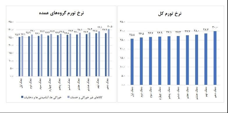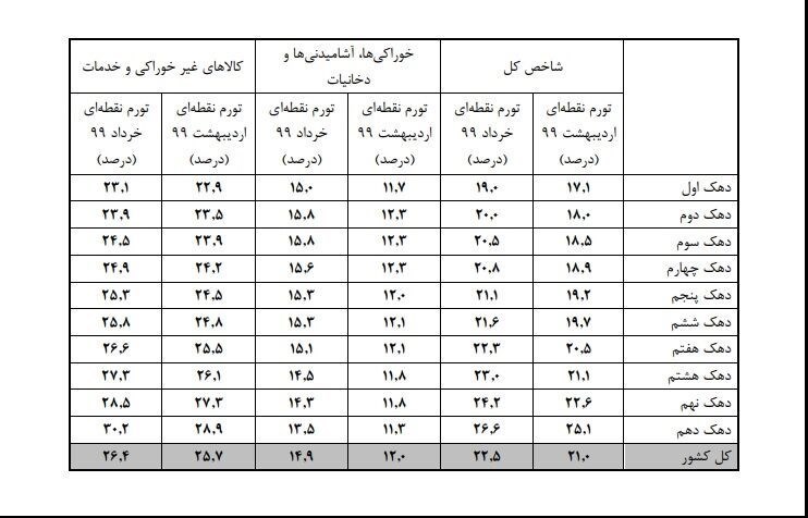 نرخ تورم کل کشور در خرداد ماه ١٣٩٩ برابر 27.8 درصد است که در دهکهای مختلف هزینهای در بازه 25.8 درصد برای دهک اول تا 30.0 درصد برای دهک دهم نوسان دارد. محدوده تغییرات تورم دوازده ماهه در گروه عمده «خوراکیها، آشامیدنیها و دخانیات» بین 25.4 درصد برای دهک اول تا 27.9 درصد برای دهک دهم است. همچنین اطلاع مذکور در مورد گروه عمده «کالاهای غیر خوراکی و خدمات» بین 26.1 درصد برای دهک اول تا 30.5 درصد برای دهک دهم است.