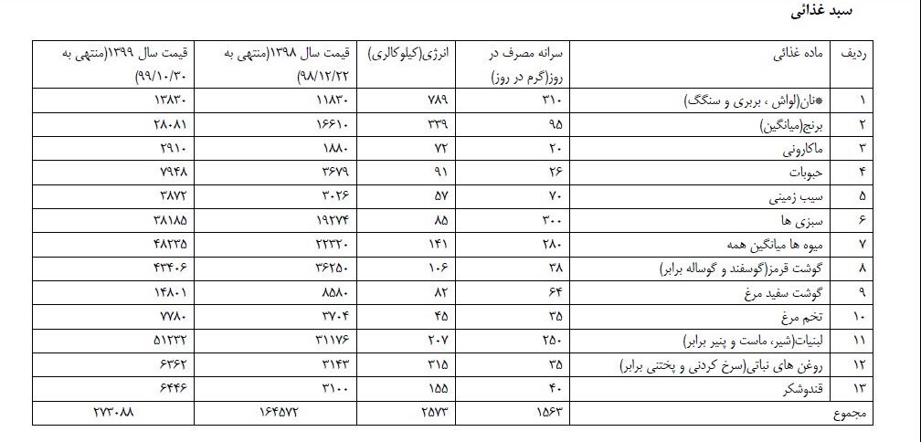 وی با بیان اینکه از آنجاییکه بر اساس داده های رسمی مرکز آمار ایران اندازه خانوار متوسط ایرانی 3.3 نفر است گفت:اگر 273088 را در 3.3 ضرب کنیم عدد به دست آمده 901190.4 است که رقم خوراکی ها و آشامیدنی های یک روز خانوار را نشان می دهد. بنابراین هزینه خوراکی ها و آشامیدنی های ماهانه یک خانواده اگر911190.04را در 30روز ضرب کنیم عدد به دست آمده 27035712 می شود. بنابراین بر اساس داده های تورمی دی ماه, یک خانوار متوسط ایرانی فقط 2میلیون و 703 هزار تومان هزینه خوراکی ماهیانه دارد. باید دقت کنیم که هزینه سبد خوراکیها به تنهایی، حدود صد هزار تومان از دستمزد فعلی کارگران که 2 میلیون و 611هزار تومان است، بیشتر است.