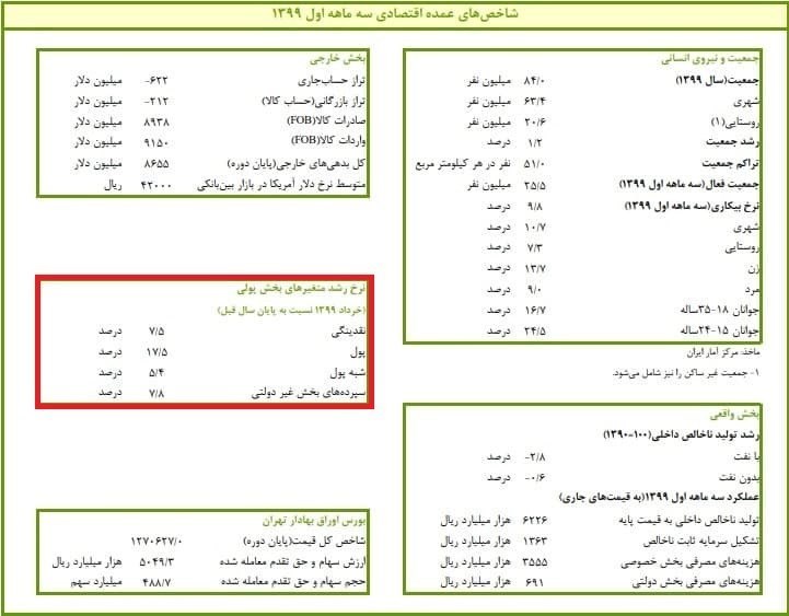 به گزارش پایگاه خبری«عصر اعتبار» به نقل از ایبنا، بررسی جزئیات گزارش منتشر شده توسط بانک مرکزی از شاخص های عمده اقتصادی در سه ماهه دوم سال 1399، بیانگر رشد 17.1 درصدی نقدینگی در شهریورماه 1399 نسبت به پایان سال قبل است. در سه ماهه اول سال جاری، نرخ رشد نقدینگی در پایان خردادماه، 7.5 درصد نسبت به پایان سال قبل بود
