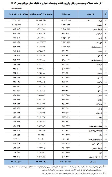 شایان ذکر است نسبت تسهیلات به سپردهها بعد از کسر سپرده قانونی 81.1 درصد است که نسبت به مقطع مشابه سال قبل و پایان سال قبل، به ترتیب 2.7 و 1.7 واحد درصد افزایش نشان میدهد. نسبت مذکور در استان تهران 94.8 درصد و در استان کهگیلویه و بویراحمد 115.1 درصد است.