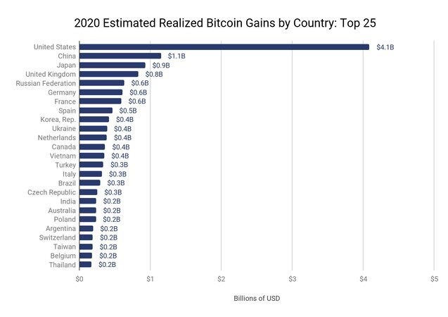 نتایج این گزارش نشان داد، سرمایهگذاران مستقر در ایالاتمتحده بیش از 4 میلیارد دلار سود واقعی بیتکوین در طول سال کسب کردهاند این رقم سه برابر بیشتر از چین است تحولی که احتمالا در پشت مبادلات مستقر در ایالاتمتحده وجود داشته و به ورودیهای عظیم در اوایل سال اشاره دارد و به نظر میرسد بیشتر آن در پایان سال تحقق یافته است.
