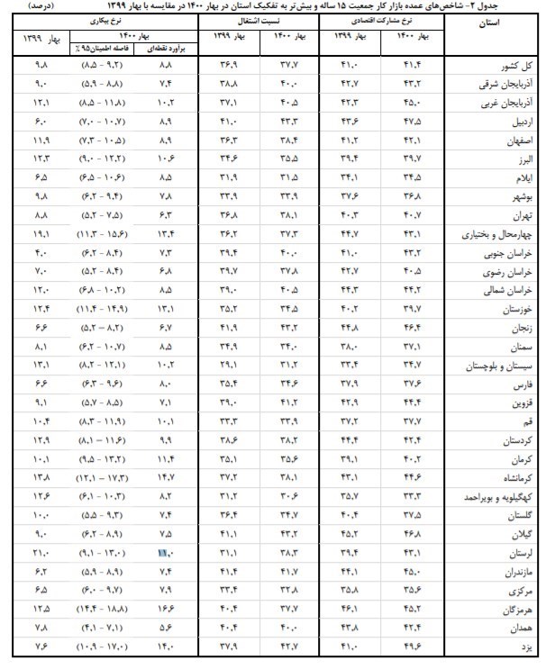 کمترین نرخ بیکاری مربوط به استانهای همدان (5.6 درصد) و تهران (6.3 درصد) است. در مقابل استانهای هرمزگان (با 16.6 درصد) و کرمانشاه (با 14.7 درصد) بالاترین نرخ بیکاری را داشتند.