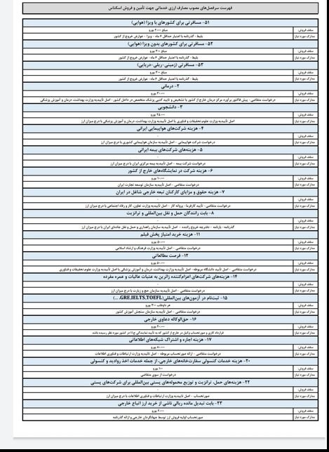 در ادامه، میتوانید آخرین تغییرات در سرفصلهای فروش ارز بابت مصارف ارز خدماتی توسط صرافیها را مشاهده کنید: