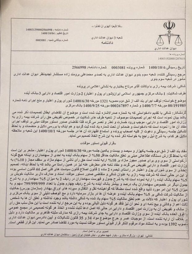 عصر اعتبار- به دنبال تکذیب رأی دیوان عدالت اداری برای توقف مصوبه بانک مرکزی درباره تعیین تکلیف مالکیت بانک آینده، وزارت امور اقتصادی و دارایی تصویر حکم مربوطه را منتشر کرد.