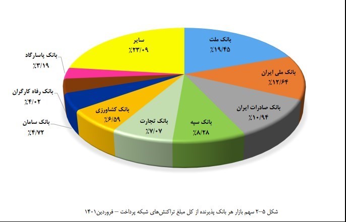 پس از بانک ملت به ترتیب بانکهای ملی، سپه، صادرات، کشاورزی، تجارت، پارسیان، سامان و رفاه کارگران بیشترین سهم را از تعداد تراکنشها و بانکهای ملی، صادرات، سپه، تجارت، کشاورزی، سامان، رفاه کارگران و پاسارگاد، بیشترین سهم را از مبلغ تراکنشهای شبکه پرداخت داشتهاند. بنابراین میتوان نتیجه گرفت همچون اسفندماه سال گذشته، بیش از 76 درصد از تعداد و مبلغ تراکنشهای بانکی در نخستین ماه امسال به 9 بانک رسیده است.
