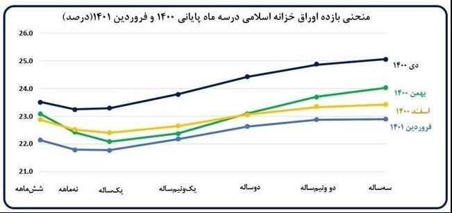 از دیماه سال 1400 با کاهش نرخهای بازده اوراق مالی اسلامی دولتی، منحنیهای بازده اسناد خزانه اسلامی به پایین منتقل شده است؛ بهطوری که منحنی بازده فروردین در سطحی پایینتر از منحنیهای بازده سه ماه پیش از آن واقع شده است.