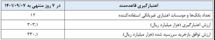 بانکها و موسسات اعتباری غیربانکی میتوانند در روزهای شنبه تا چهارشنبه از اعتبارگیری قاعدهمند (دریافت اعتبار با وثیقه از بانک مرکزی) مشروط به در اختیار داشتن اوراق مالی اسلامی دولتی و در قالب توافق بازخرید با نرخ سقف دالان نرخ سود (22 درصد) استفاده کنند.