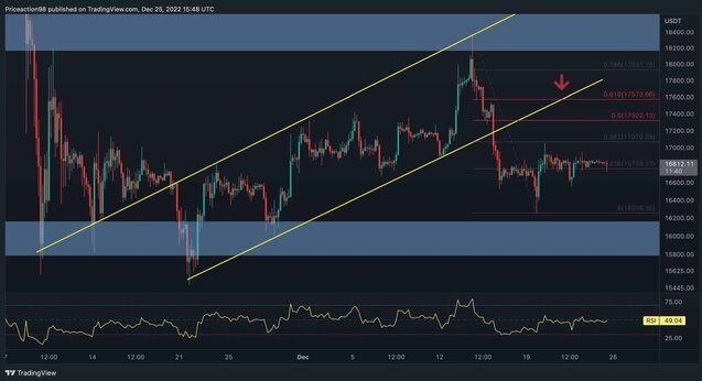فرض کنید قیمت به بالاتر از سطح ذکر شده برگردد، یک اصلاح به سطح فیب 0.618 و خط روند شکسته، موانع اصلی برای محدوده 18 هزار دلار خواهند بود.