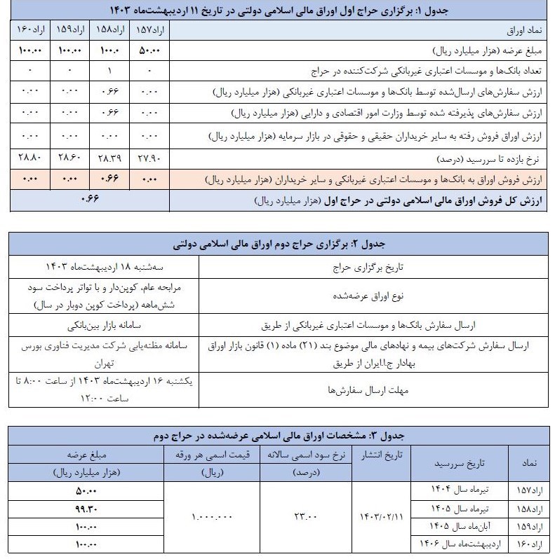 عصر اعتبار- ضمن اعلام نتیجه اولین مرحله از حراج اوراق مالی اسلامی دولتی در سال ۱۴۰۳ (مورخ ۱۱ اردیبهشت ماه ۱۴۰۳)، به اطلاع می رساند حراج جدید اوراق یاد شده در تاریخ ۱۸ اردیبهشت ماه سال جاری برگزار خواهد شد.