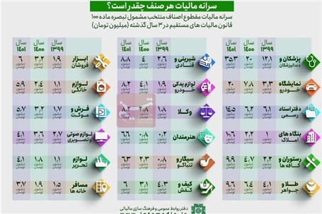 عصر اعتبار- جدول سرانه مالیاتی ۱۵ صنف در سه سال گذشته در حالی منتشر شد که مالیاتی که تمامی این صنوف در طول یک سال پرداخت میکنند، تقریباً از مالیات یک سال یک کارگر کمتر است.
