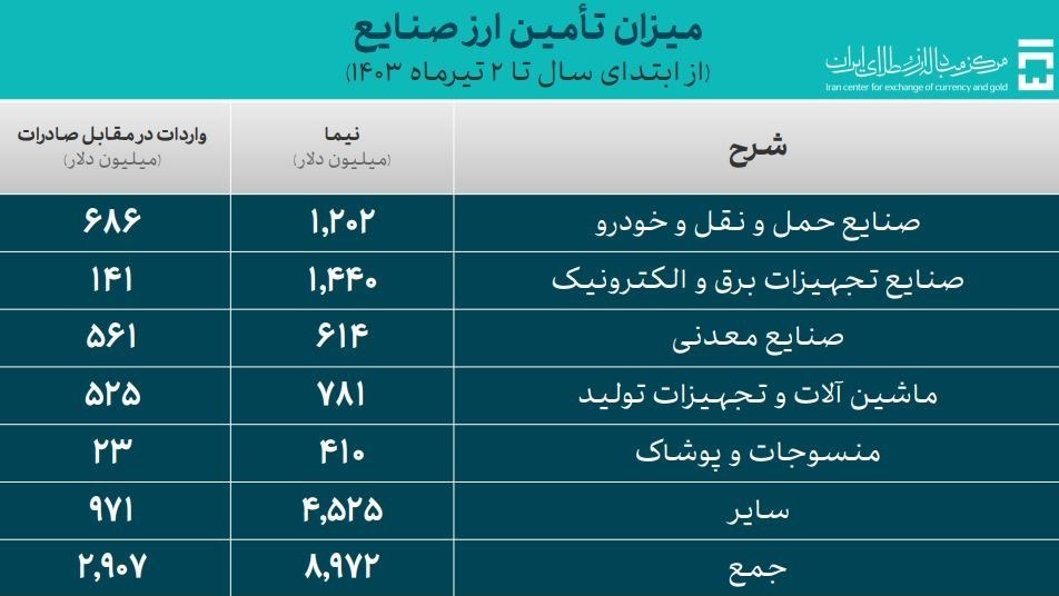 سخنگوی مرکز مبادله ارز و طلای ایران افزود: تامین ارز نیمایی برای «صنایع حمل و نقل و خودرو» معادل یک میلیارد و 202 میلیون دلار، «صنایع تجهیزات برق و الکترونیک» معادل یک میلیارد و 440 میلیون دلار، «صنایع معدنی» معادل 614 میلیون دلار، «ماشین آلات و تجهیزات تولید» معادل 781 میلیون دلار و «منسوجات و پوشاک» معادل 410 میلیون دلار صورت گرفته است. این گروه های صنایع همچنین به ترتیب 686، 141، 561، 525 و 23 میلیون دلار ارز توافقی یا واردات در مقابل صادرات تا پایان روز 30 خردادماه سال جاری دریافت کردهاند.
