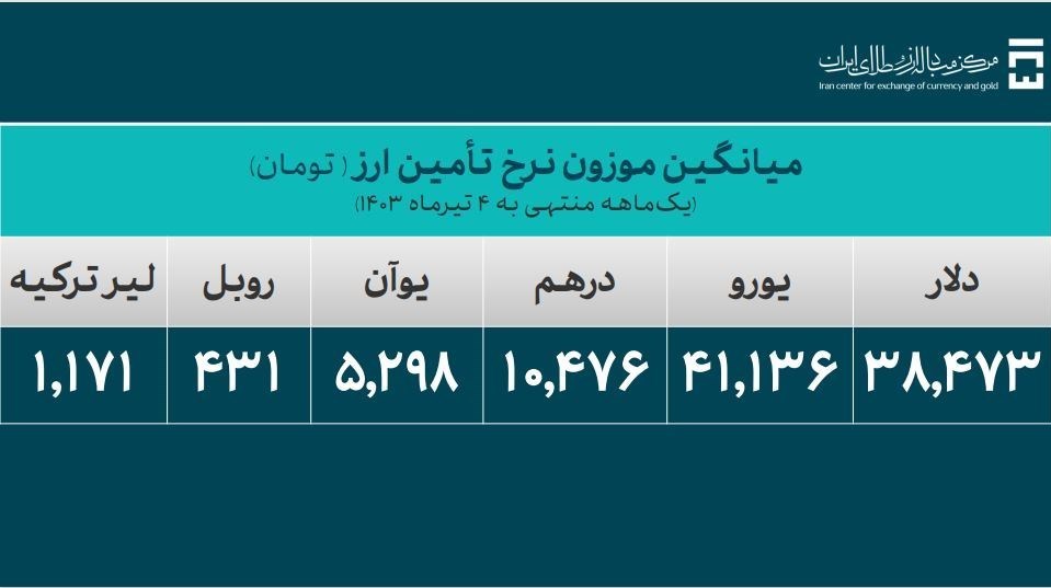 بالسینی افزود: میانگین موزون نرخ ارز یک ماهه منتهی به 4 تیر، 38 هزار و 473 تومان برای دلار، 41 هزار و 136 تومان برای یورو، 10 هزار و 476 تومان برای درهم و 5 هزار، 298 تومان برای یوآن، 431 تومان برای روبل و 1هزار و 171 تومان برای لیر محاسبه شده است.