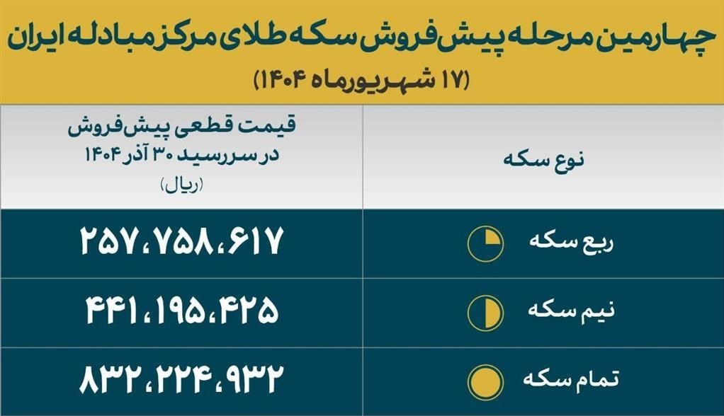به گزارش پایگاه خبری «عصر اعتبار» به نقل از  روابط عمومی بانک مرکزی، براساس اعلام مرکز مبادله ارز و طلای ایران قیمت هر قطعه سکه تمام بهار آزادی (امامی ) ضرب 1386در چهارمین مرحله طرح پیش‌فروش سکه با موعد تحویل 30 آذر سالجاری ، 83 میلیون و 224 هزار و 493 تومان اعلام شد همچنین قیمت هر قطعه  نیم‌سکه 44 میلیون و 119 هزار و 543 تومان و ربع‌سکه 25 میلیون و 775 هزار و 862 تومان تعیین شد.