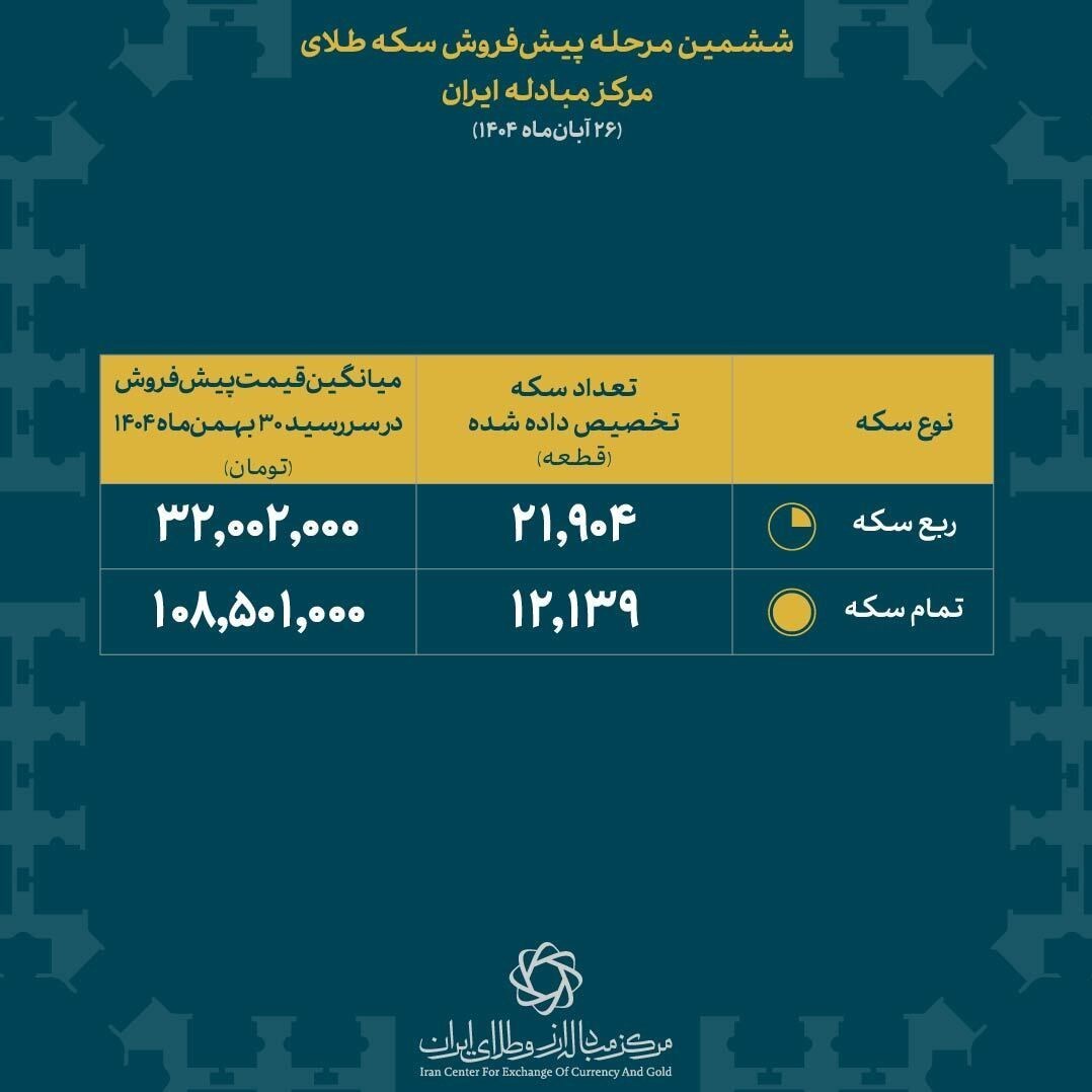 عصر اعتبار- ششمین مرحله پیش فروش سکه طلای مرکز مبادله ایران با تخصیص ۳۴ هزار و ۴۳ قطعه انواع مسکوک طلا به پایان رسید.