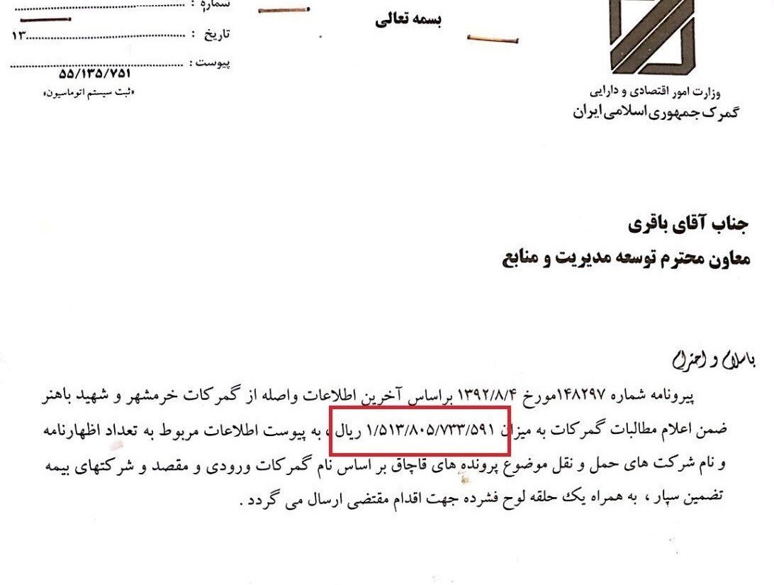بر اساس نامه زیر تنها تا سال 92 بدهی شرکتهای بیمه که لیست این بدهی موجود میباشد بالغ بر 150 میلیارد تومان بوده است. در متن این نامه آمده است، بر اساس آخرین اطلاعات واصله از گمرکات خرمشهر و شهید باهنر میزان مطالبات گمرکات بالغ بر 150 میلیارد تومان عنوان شده و در پیوست این نامه اطلاعات مربوط به اظهارنامه و نام شرکتهای حمل و نقل موضوع پروندههای قاچاق بر اساس نام شرکتهای بیمه مشخص شده است.