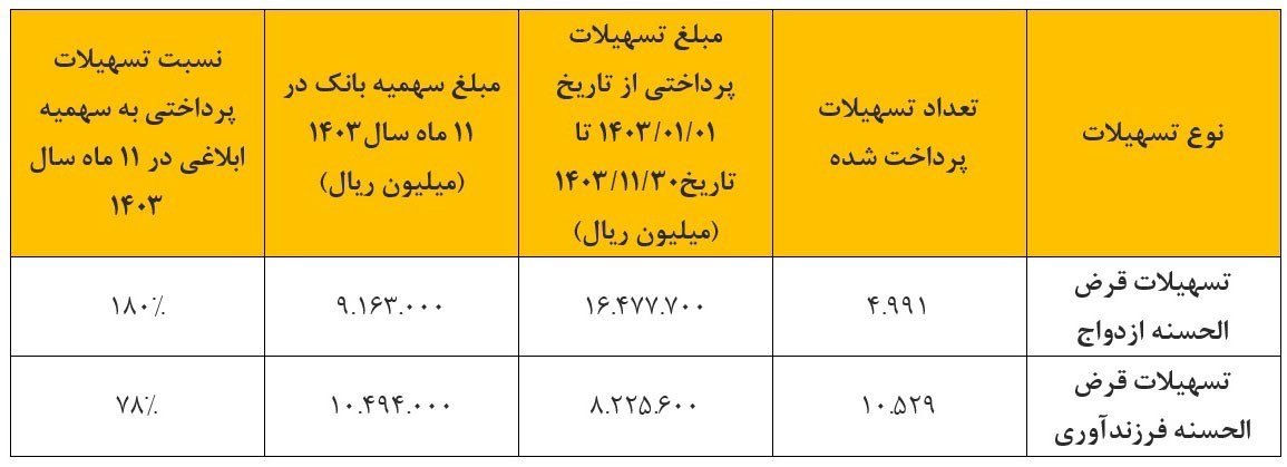 بر اساس آمار ارائه شده (طبق جدول زیر)، این بانک در 11 ماه ابتدایی سال جاری با پرداخت 4.991 مورد تسهیلات ازدواج، فراتر از سهمیه تعیین شده عمل کرده و نسبت تسهیلات پرداختی آن به سهمیه ابلاغی معادل 180درصد بوده است. در زمینه تسهیلات فرزندآوری نیز، تعداد 10.529 مورد تسهیلات پرداخت شده که بیانگر عملکرد مثبت و تحقق 78‌درصدی از سهمیه اعلامی می‌باشد.