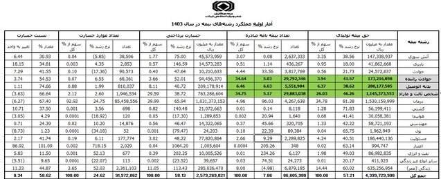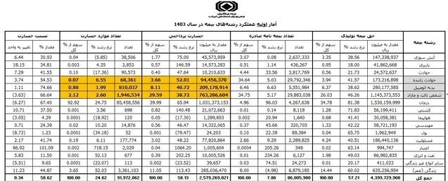 براساس داده‌های بیمه مرکزی در سال 1403، در صنعت بیمه کشور، نزدیک به 440 هزار میلیارد تومان بیمه نامه فروخته شد، بیش از 86 میلیون فقره بیمه نامه صادر، بیش از 257 هزار میلیارد تومان خسارت بیمه‌ای پرداخت، بیش از 91 میلیون و 972 هزار مورد (فقره) خسارت پرداخت و نسبت کل خسارت صنعت بیمه در این سال به 58.6 درصد رسید.