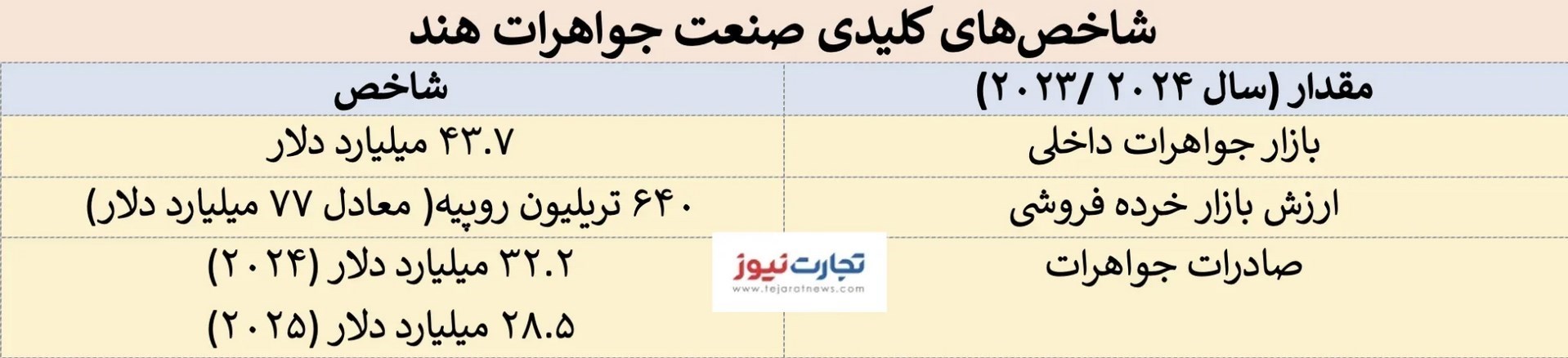 آمارها حاکی از آن است که ارزش بازار فروش جواهرات خرده فروشی در هند از 50 تریلیون روپیه در سال 2019 به 64 تریلیون روپیه در سال 2024 یعنی رقمی بالغ بر 77 میلیارد دلار با نرخ رشد ترکیبی هشت درصد افزایش یافته است .