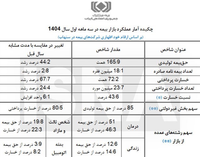 گفتنی است؛ سهم چهار رشته بیمه عمده در بازار بیمه در پایان ماه قبل این گزارش (پایان اردیبهشت 1404) برای رشته بیمه درمان 56.4 درصد، برای بیمه شخص ثالث 17.2 درصد، برای بیمه زندگی 11.8 درصد و برای بیمه بدنه اتومبیل 3.4 درصد از حق بیمه تولیدی و در بخش خسارات پرداختی برای رشته بیمه درمان 44.5 درصد، برای بیمه شخص ثالث 21.8 درصد، برای بیمه زندگی 16.8 درصد و برای بیمه بدنه اتومبیل 8.6 درصد بود.