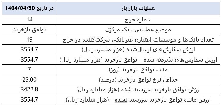 عصر اعتبار- باتوجه به پیش بینی بانک مرکزی از وضعیت نقدینگی در بازار بین بانکی، موضع این بانک در این هفته توافق بازخرید بود. از این رو بانک مرکزی به اجرای عملیات بازار باز در قالب توافق بازخرید به مبلغ ۳۵۵۴.۷ هزار میلیارد ریال اقدام کرد.