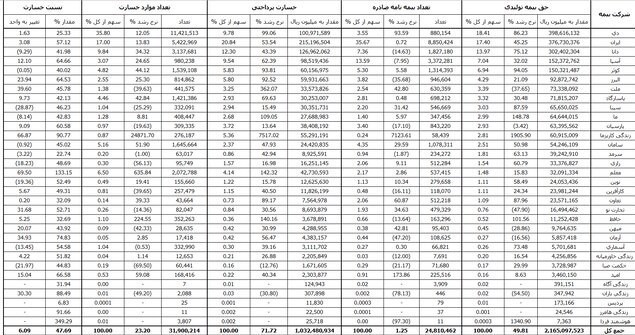 بیمه دی با حق بیمه 39.8 همتی و سهم 18.4 درصدی در جایگاه اول، بیمه ایران با حق بیمه 37.6 همتی و سهم 17.4 درصدی در جایگاه دوم و بیمه دانا با حق بیمه 30 همتی و سهم 13.9 درصدی در جایگاه سوم شرکت‌ها با بالاترین حق بیمه تولیدی قرار گرفتند.