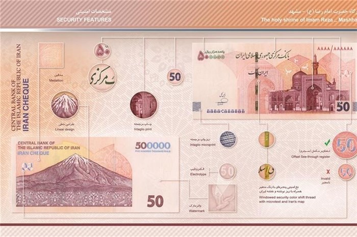 به گزارش پایگاه خبری «عصر اعتبار» به نقل از روابط عمومی بانک مرکزی، ایران چک 500،000 ریالی طرح بارگاه حضرت امام رضا (ع) (سری سوم) با ویژگیهای امنیتی به شرح زیر چاپ شده است: