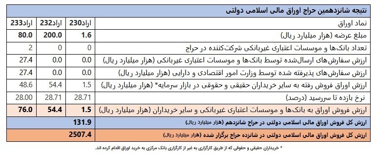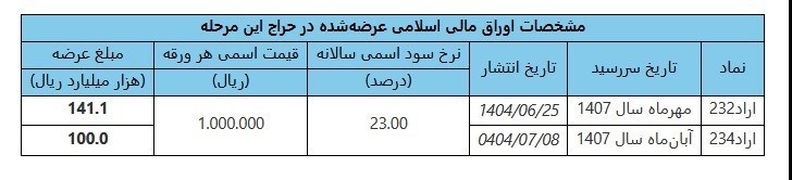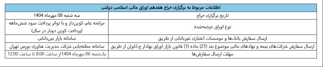عصر اعتبار- نتیجه شانزدهمین مرحله از حراج اوراق مالی اسلامی دولتی در سال ۱۴۰۴ (در تاریخ ۱ مهرماه ۱۴۰۴) اعلام شد. همچنین تاریخ برگزاری حراج جدید اوراق یاد شده در تاریخ ۸ مهر ماه سال جاری خواهد بود.